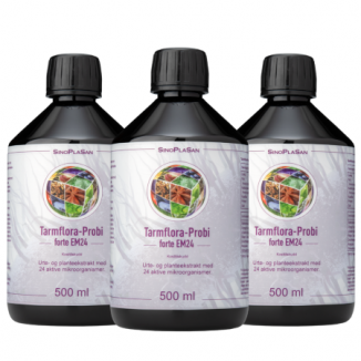 Tarmflora-Probi forte EM24 er en urte- og plantebasert probiotisk drikk med 24 aktive mikroorganismer.