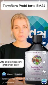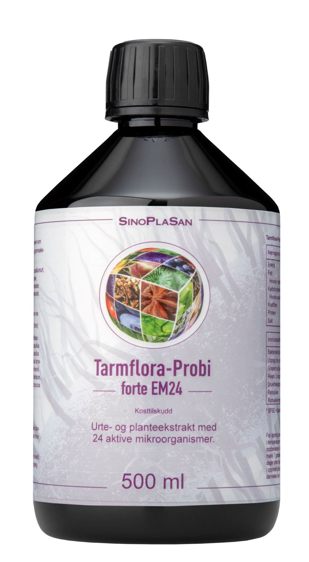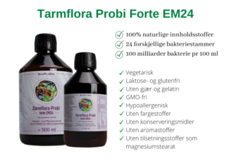 Tarmflora-Probi forte EM24 er en urte- og plantebasert probiotisk drikk med 24 aktive mikroorganismer. og ca 1*10^11 = 100.000.000.000 bakterier per 100ml)
