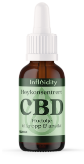 Influidity Høykonsentrert CBD Hudolje er en vegansk hudolje med kun to ingredienser: CBD og MCT-olje. Den inneholder syntetisert CBD utvunnet fra naturlige kilder som trebarklav og sitrusskall – helt fri for hamp og THC, i henhold til norsk regelverk.