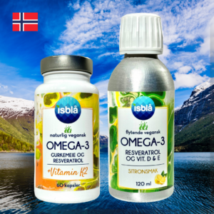 Isblå vegansk omega-3 produkt med resveratrol – et bærekraftig tilskudd for hjerte, hjerne og immunforsvar.